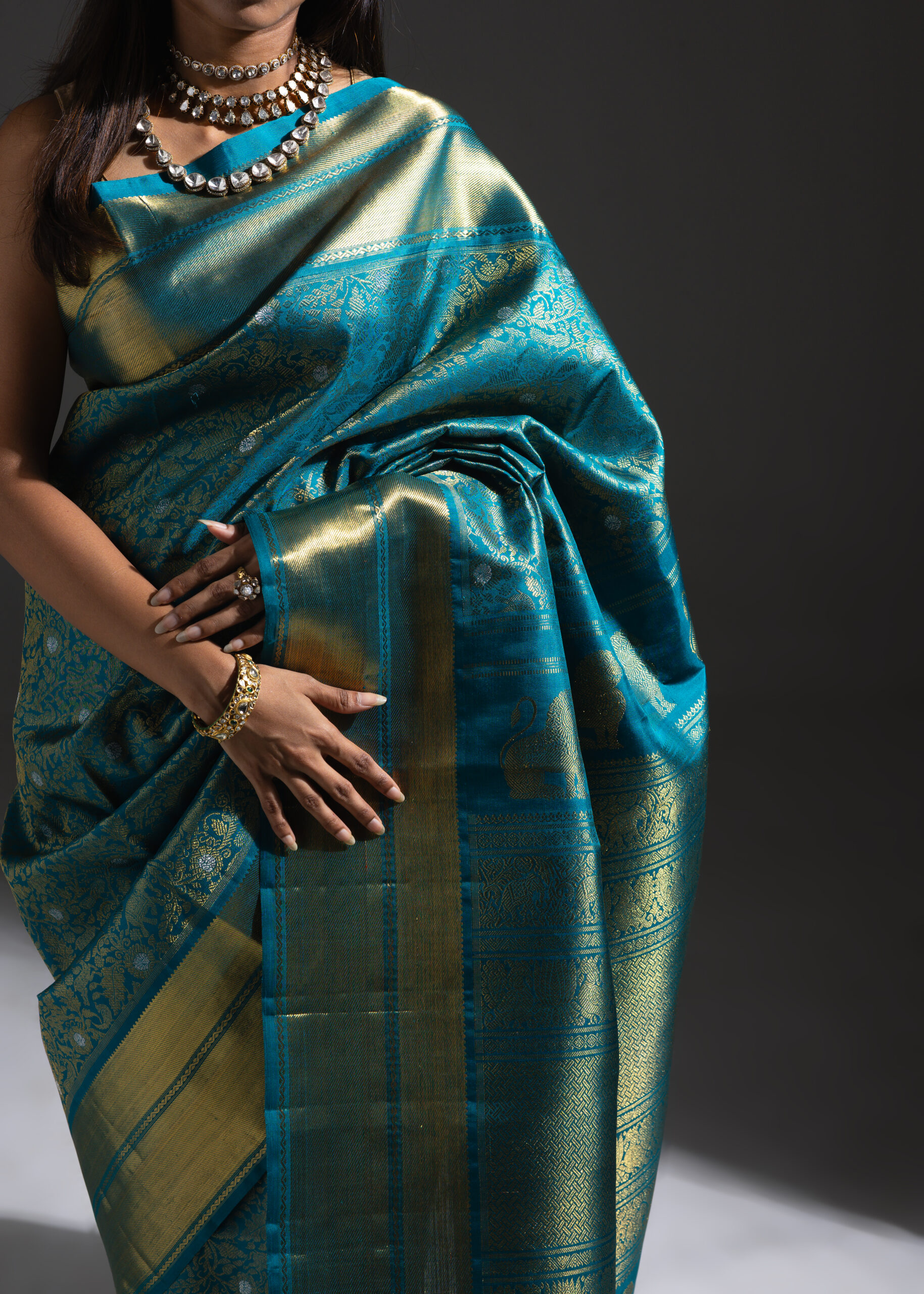 Vanasingaram is a heritage forest-inspired weave featuring intricate depictions of flora and fauna. Originating in Benarasi textiles, Kanchi’s version has been exquisitely revived after many years. Woven in aqua blue mulberry silk, this sari showcases slightly larger motifs that bring the design to life. Crafted using the Ada weaving method, the details gain a subtle 3D effect, adding depth and grandeur to the sari.