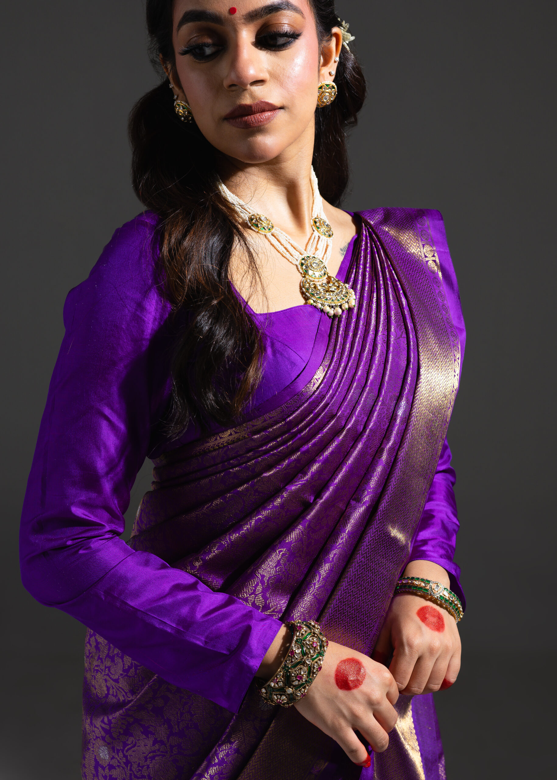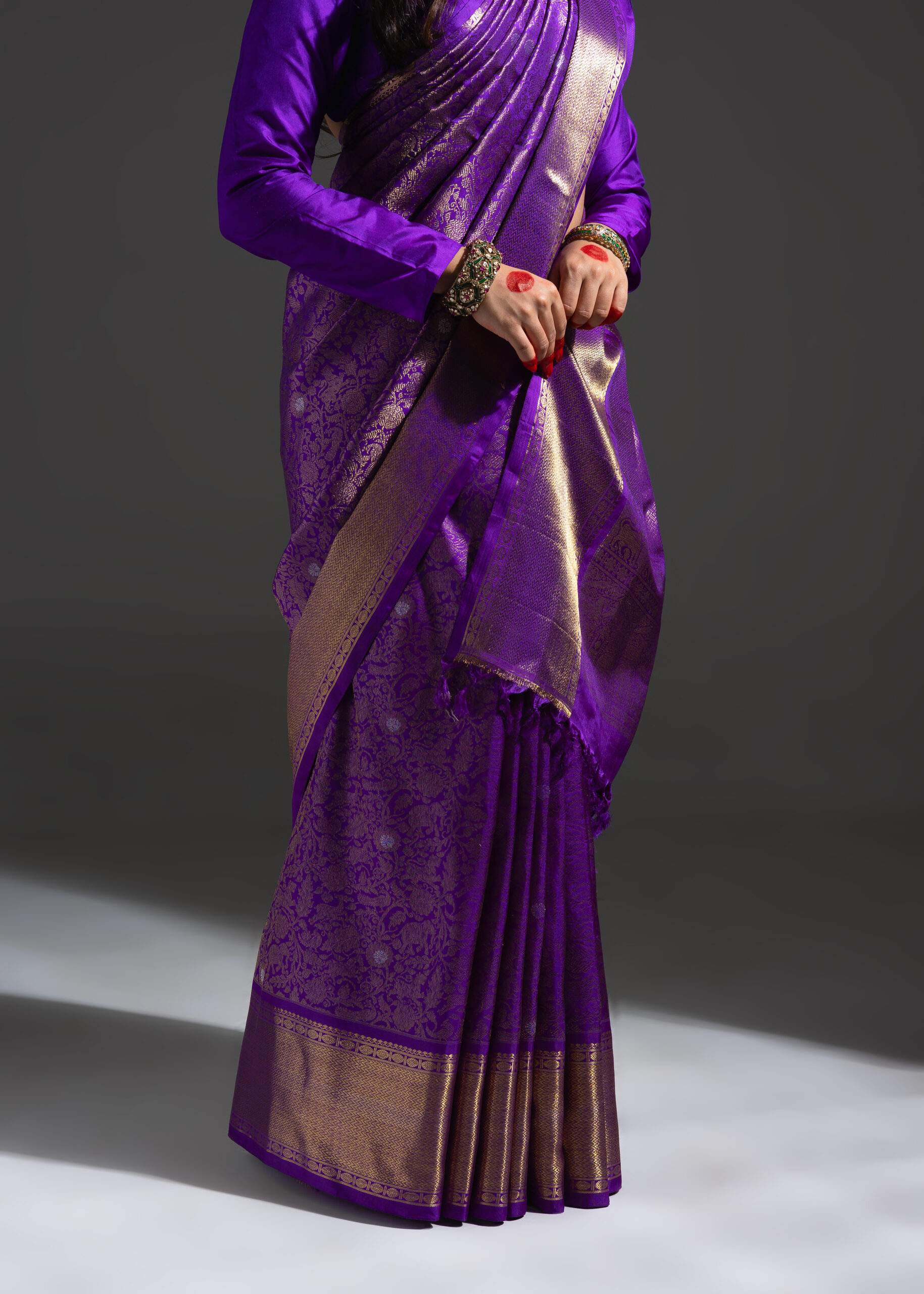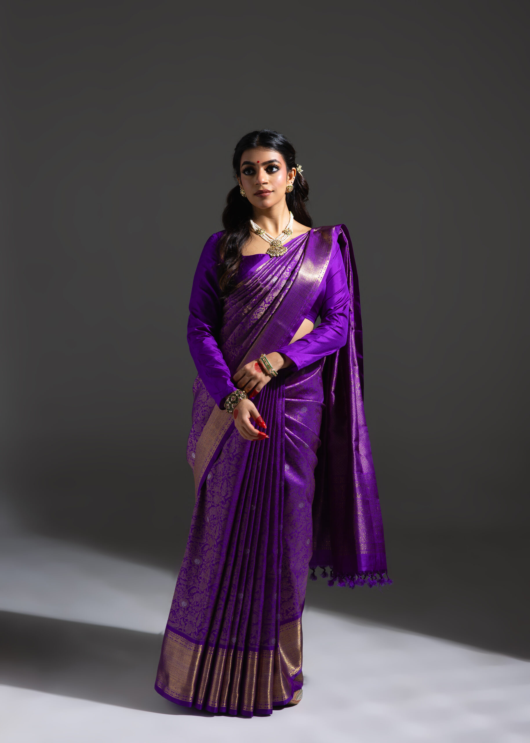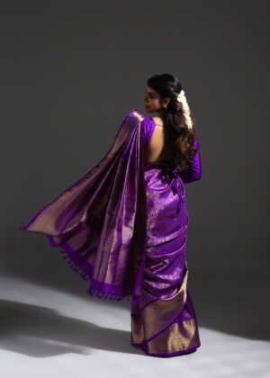 Vanasingaram is a heritage forest-inspired weave featuring intricate depictions of flora and fauna. Originating in Benarasi textiles, Kanchi’s version has been exquisitely revived after many years. Woven in electrifying aubergine mulberry silk, this sari showcases slightly larger motifs that bring the design to life. Crafted using the Ada weaving method, the details gain a subtle 3D effect, adding depth and grandeur to the sari.