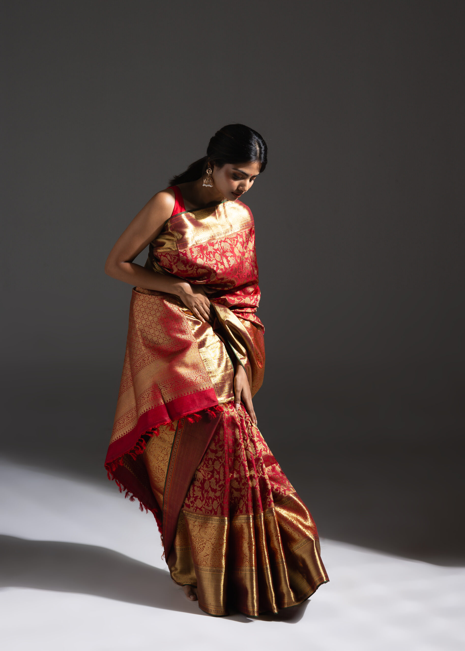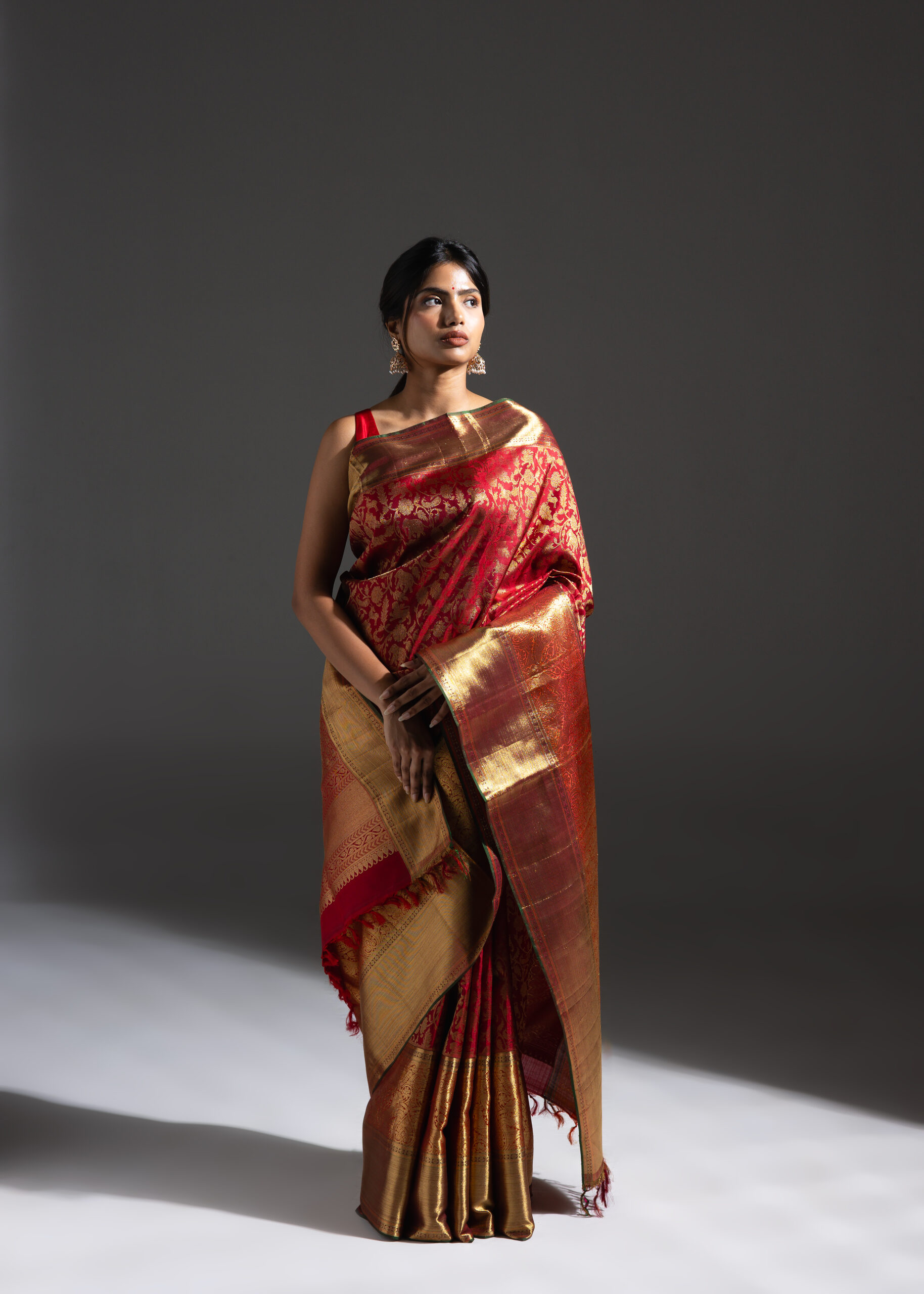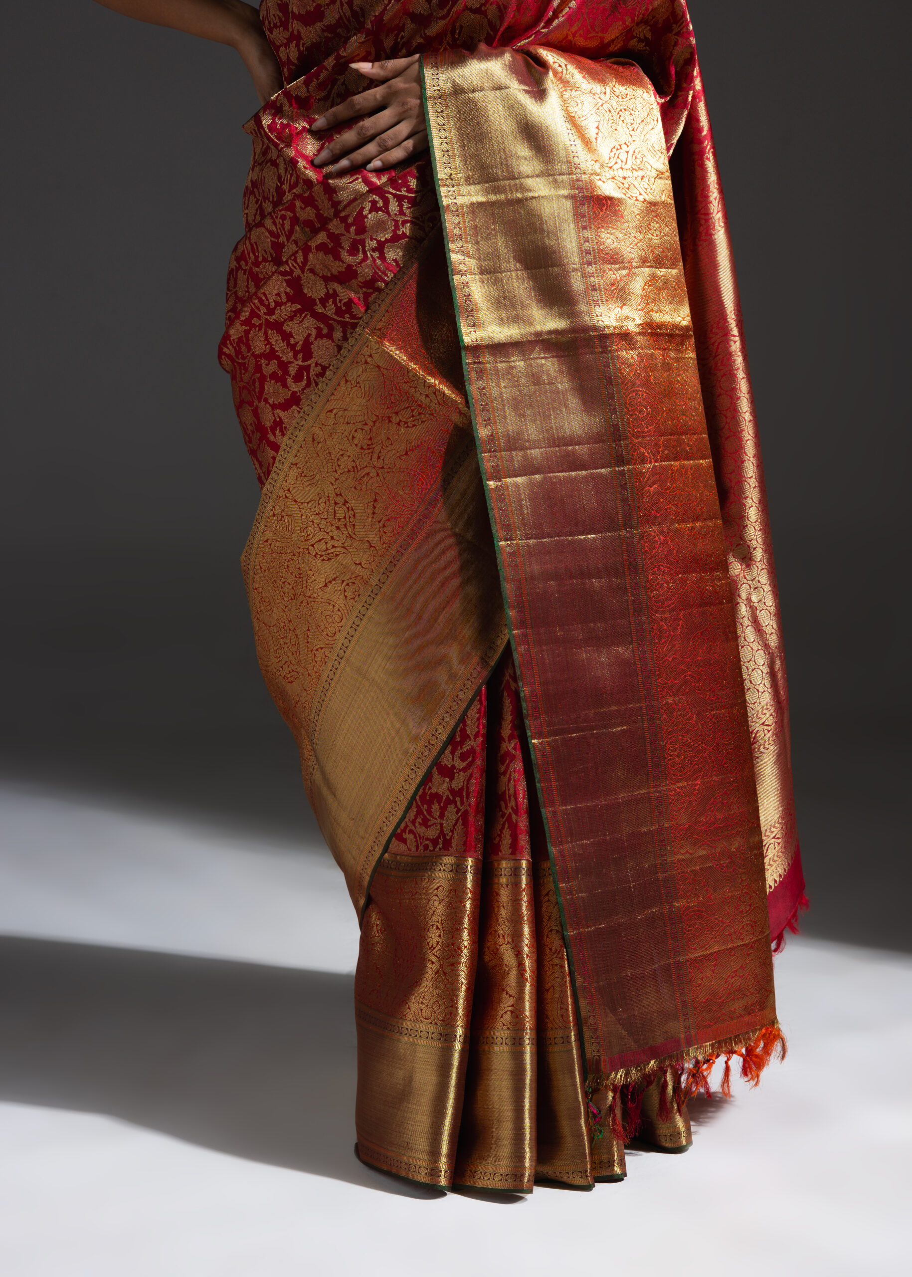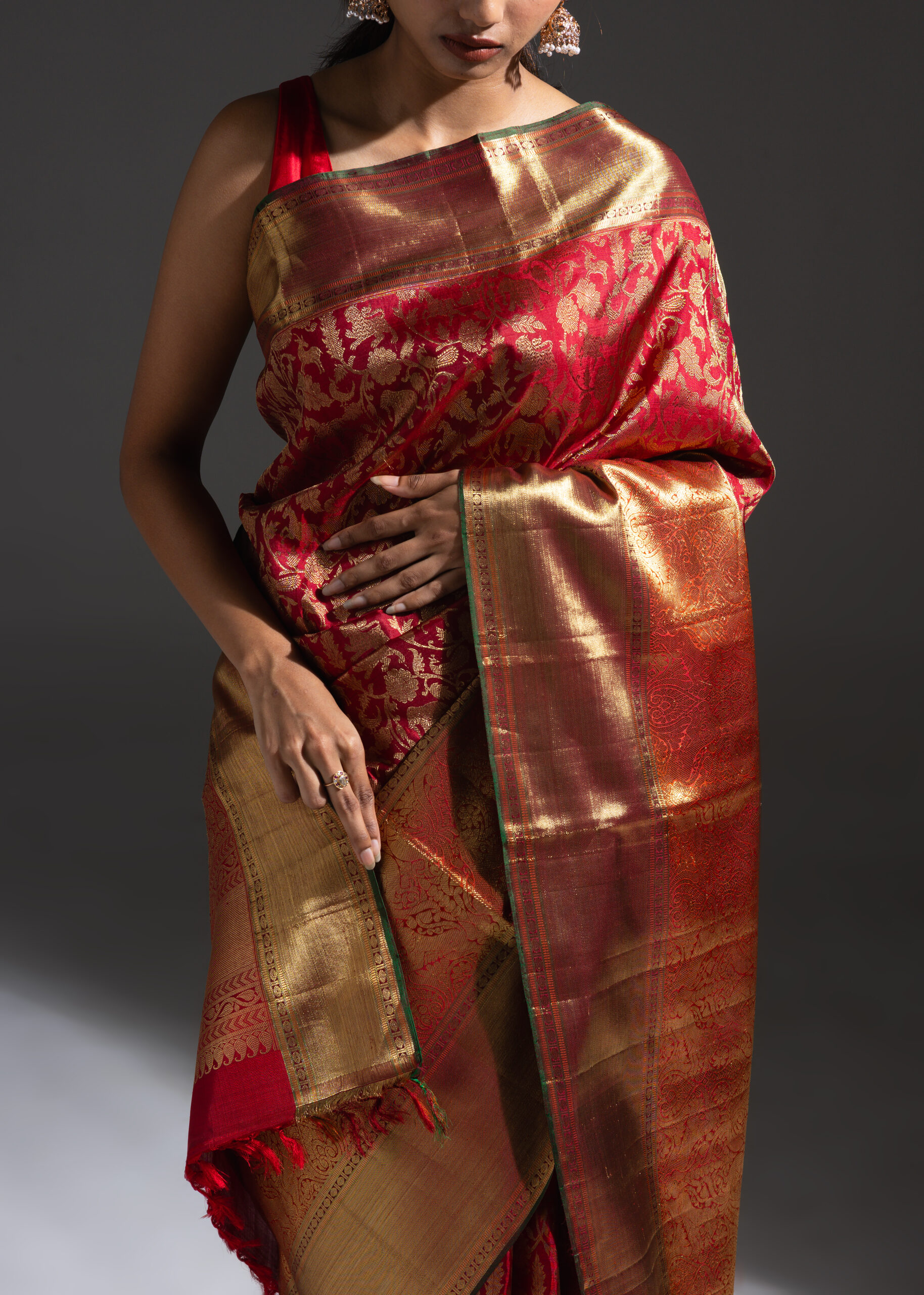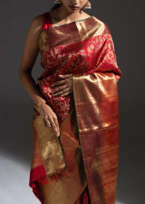 Vanasingaram is a heritage forest-inspired weave featuring intricate depictions of flora and fauna. Originating in Benarasi textiles, Kanchi’s version has been exquisitely revived after many years. Woven in warm coral silk, this sari showcases slightly larger motifs that bring the design to life. Crafted using the Ada weaving method, the details gain a subtle 3D effect, adding depth and grandeur to the sari.