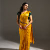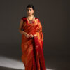 Vanasingaram—an evocative forest render of flora and fauna—is a time-honoured weave that traces its origins to Benarasi textiles. Kanchi’s interpretation has now been revived to perfection after many years. Woven in rich brown mulberry silk, the sari features smaller, tightly composed motifs that create a refined, intricate render. Delicate silver butis scattered across the body add a play of negative space, beautifully lifting the gold weave. A classic Bavanji gold border enhances the sari’s quiet elegance, while the pallu is richly filled with the heritage weave, completing the look with timeless charm.