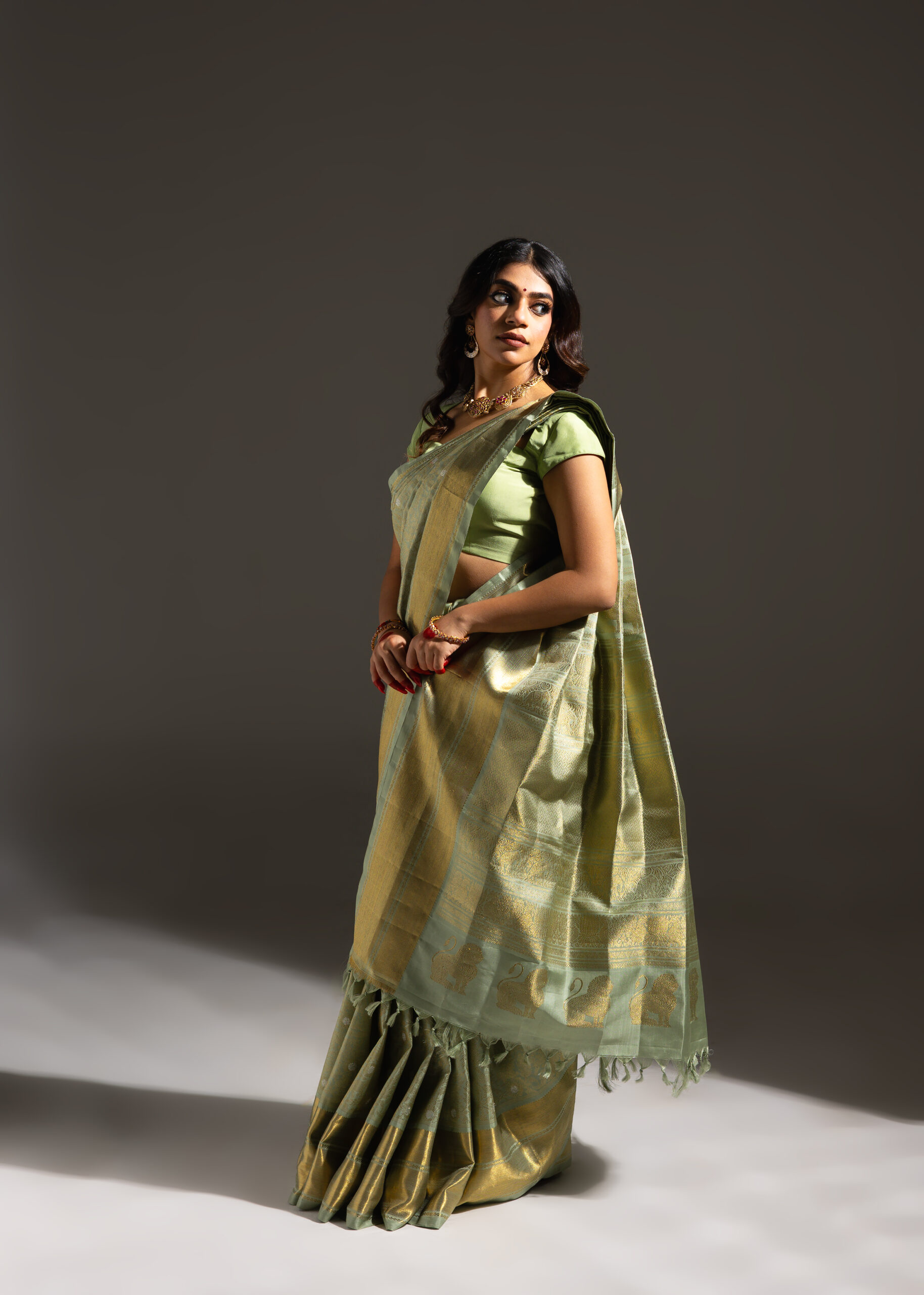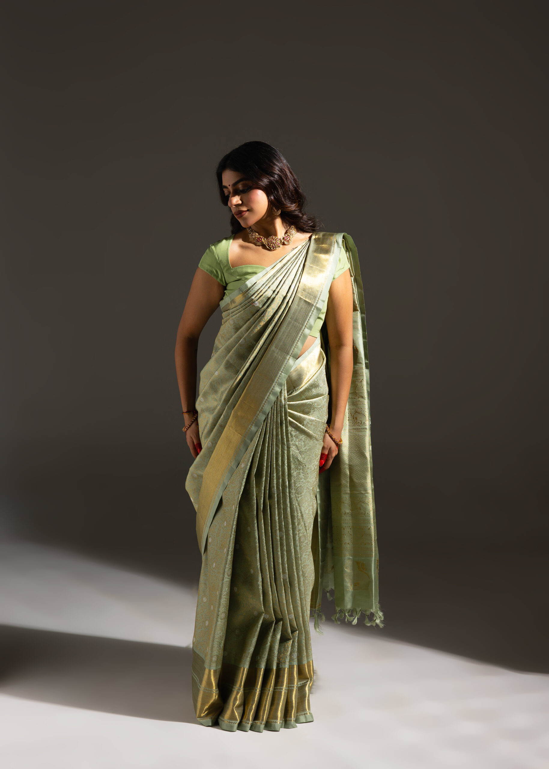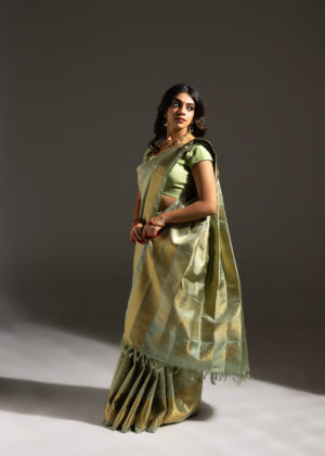 Vanasingaram is a heritage forest-inspired weave featuring intricate depictions of flora and fauna. Originating in Benarasi textiles, Kanchi’s version has been exquisitely revived after many years. Woven in rich pistachio green mulberry silk, this sari showcases slightly larger motifs that bring the design to life. Crafted using the Ada weaving method, the details gain a subtle 3D effect, adding depth and grandeur to the sari.