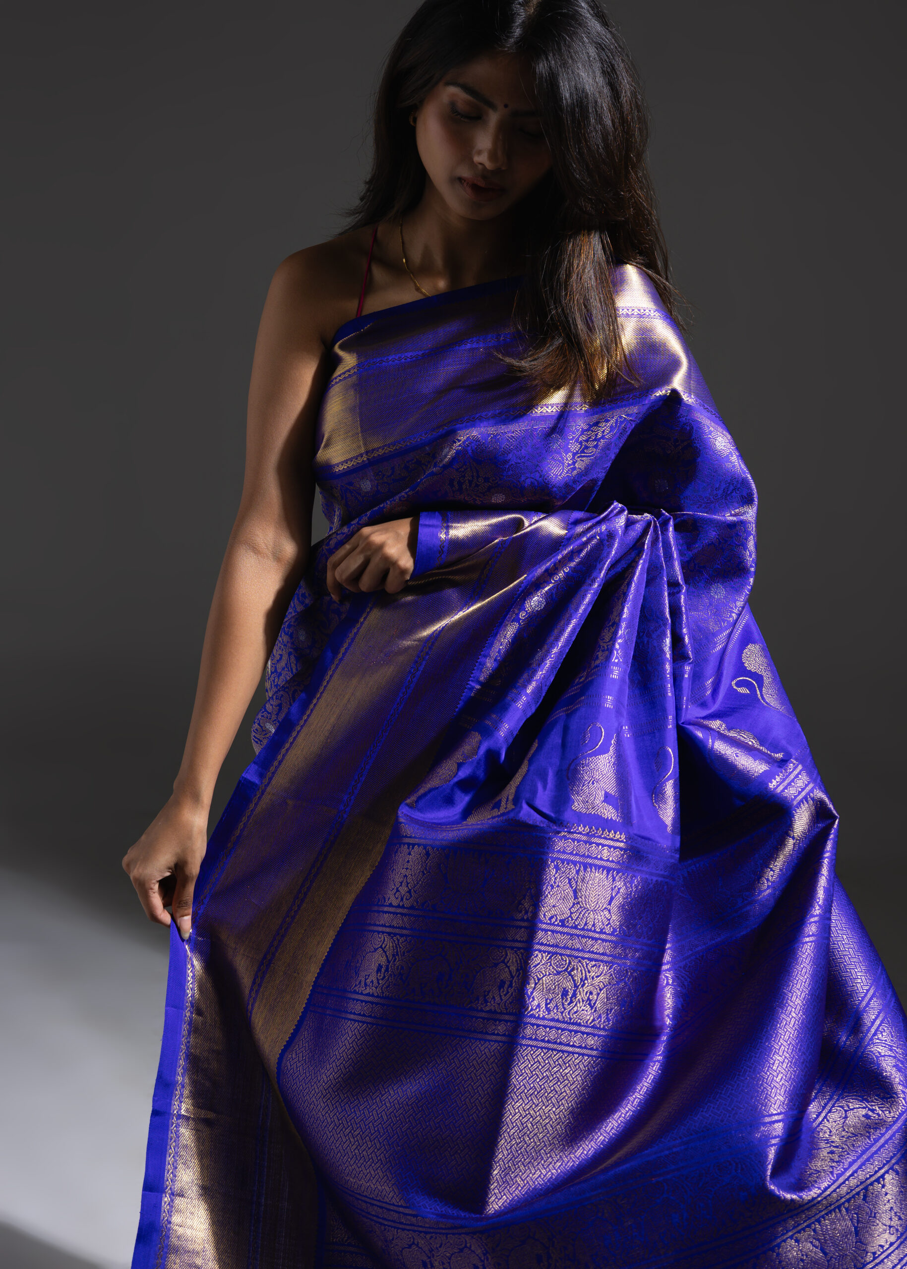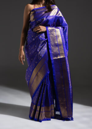 Vanasingaram is a heritage forest-inspired weave featuring intricate depictions of flora and fauna. Originating in Benarasi textiles, Kanchi’s version has been exquisitely revived after many years. Woven in striking royal blue mulberry silk, this sari showcases slightly larger motifs that bring the design to life. Crafted using the Ada weaving method, the details gain a subtle 3D effect, adding depth and grandeur to the sari.
