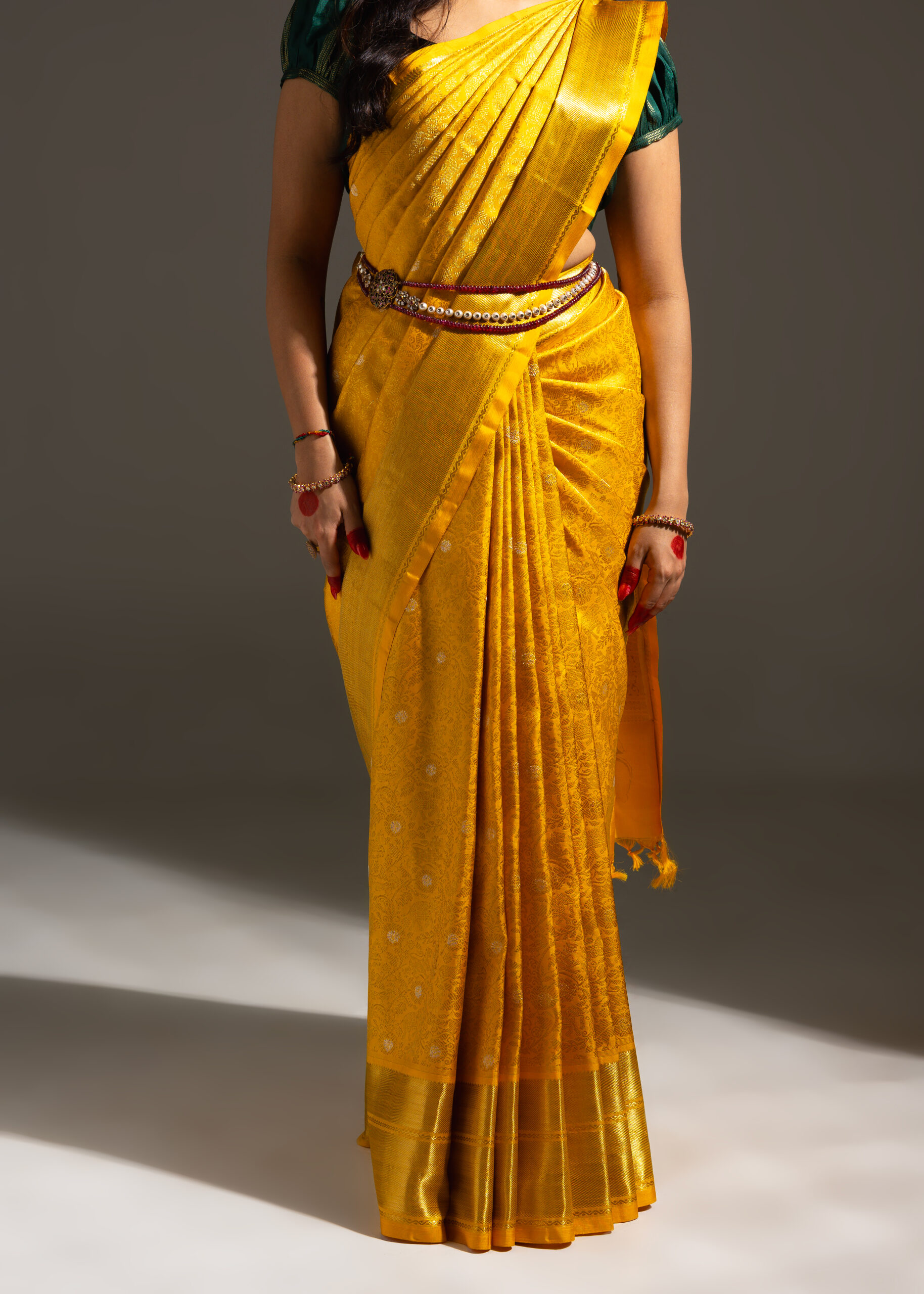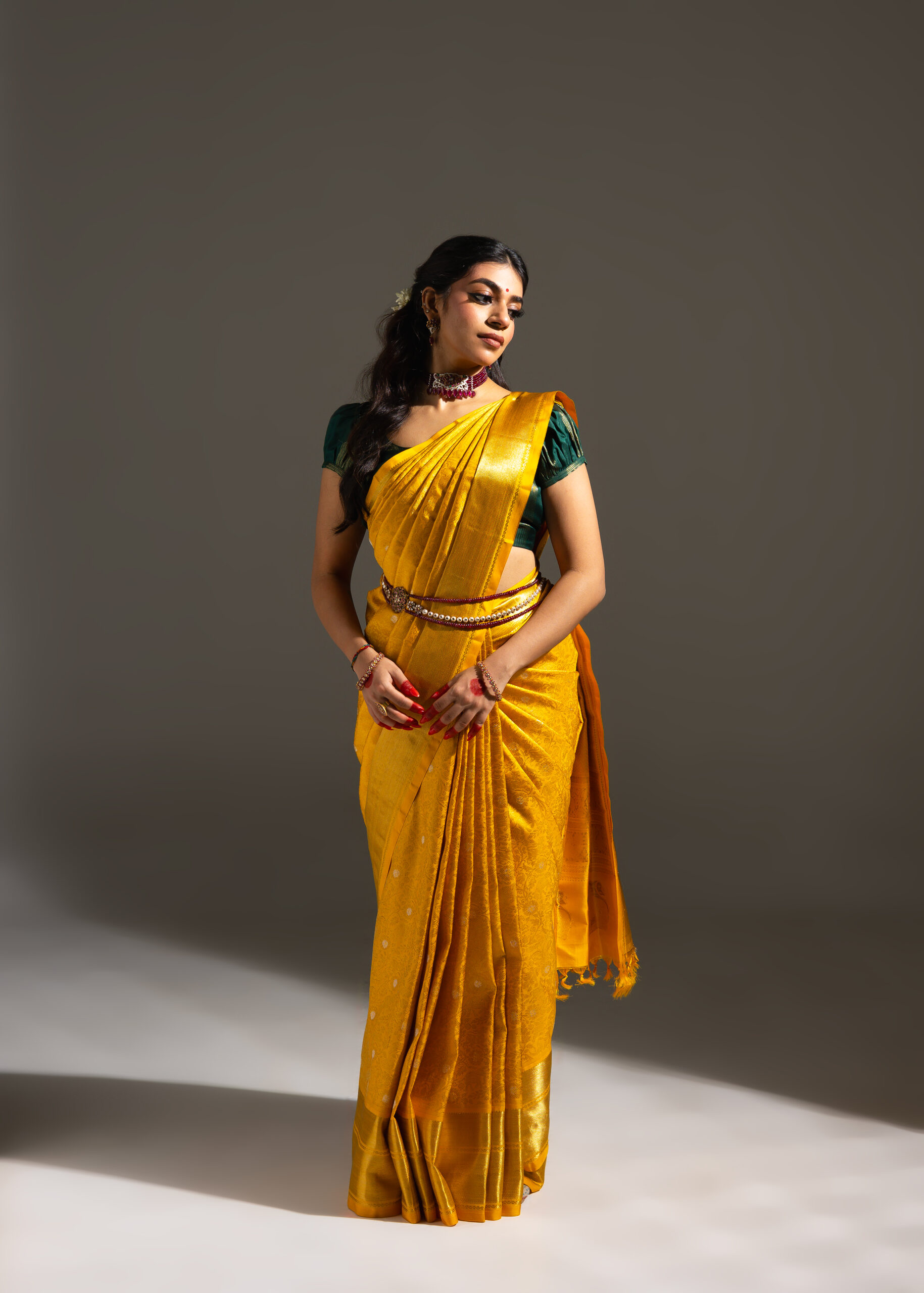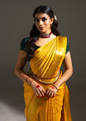 Vanasingaram is a heritage forest-inspired weave featuring intricate depictions of flora and fauna. Originating in Benarasi textiles, Kanchi’s version has been exquisitely revived after many years. Woven in rich turmeric mulberry silk, this sari showcases slightly larger motifs that bring the design to life. Crafted using the Ada weaving method, the details gain a subtle 3D effect, adding depth and grandeur to the sari.